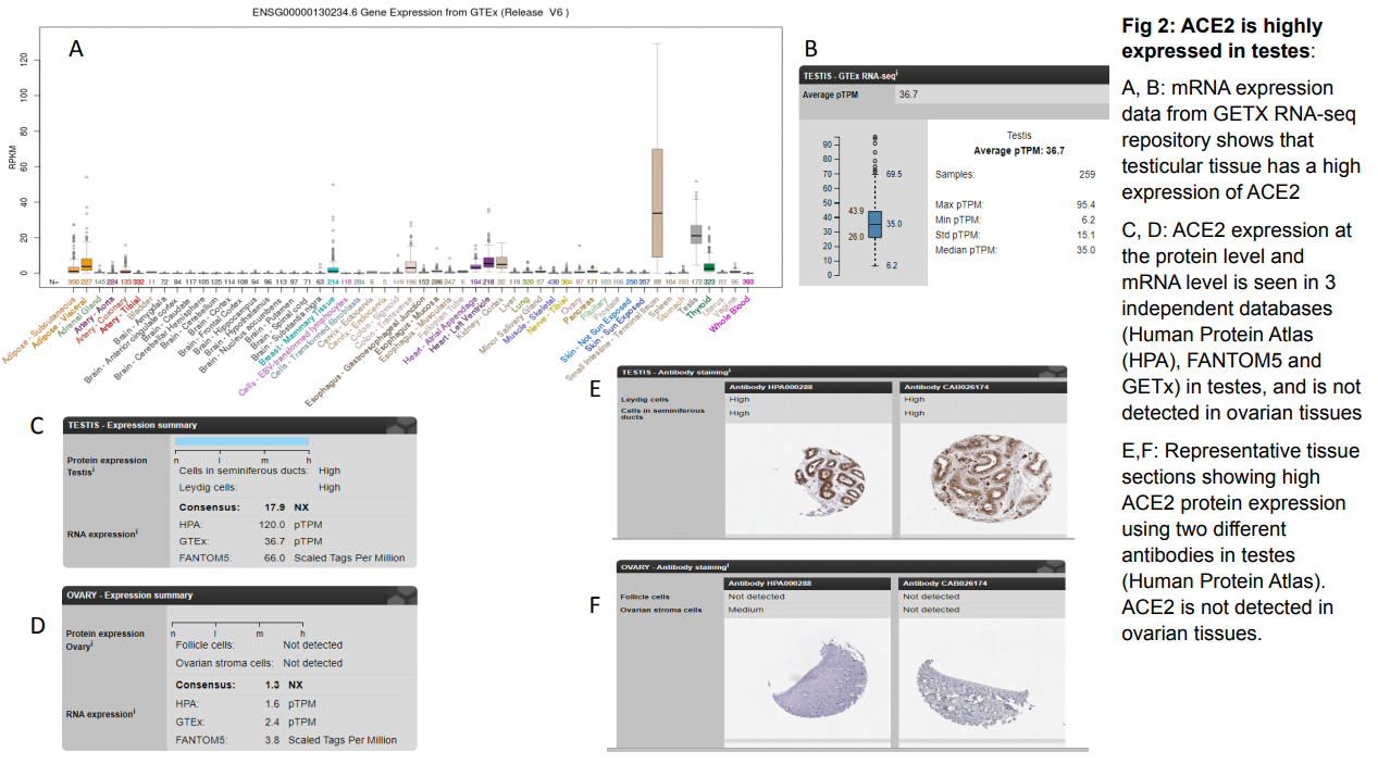 该研究认为,女性恢复得更快的原因是她们有较少的ACE2受体来处理,此前研究已表明ACE2是SARS-CoV-2入侵人体细胞的关键受体,而肺部是身体中受影响最大的区域。但ACE2受体也存在于其他器官,包括心肌、肾脏、消化道和睾丸等。研究称,在三个独立的表达数据库中,睾丸是ACE2表达最高的部位之一。相比之下,卵巢中ACE2的表达量极少。