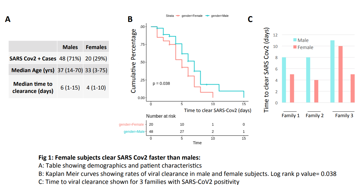 来自纽约和印度的医生在孟买共观察了68名患者,其中男性48人,女性20人。平均年龄为37岁,但这组患者中也包括3名75岁的老人。研究人员发现,女性能够从其体内清除病毒的速度平均比男性快两天。这项研究包括含男性和女性患者的两个家庭,在这两种情况下,女性比男性更快地清除了感染。