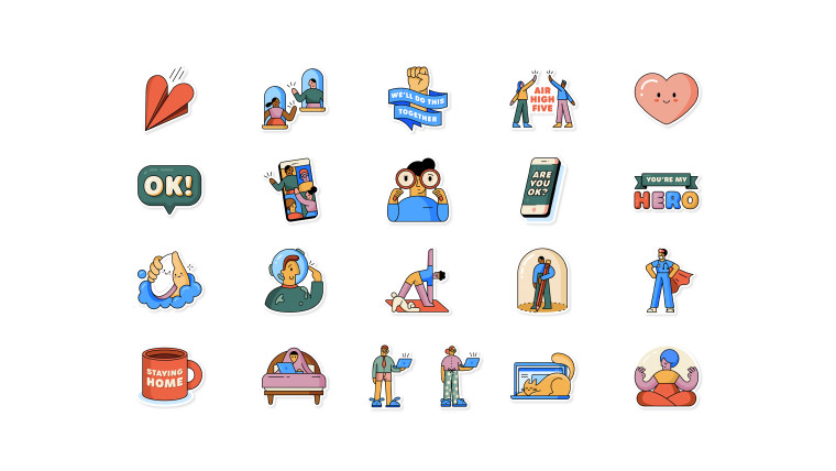 这些贴纸包含了各种封锁隔离文化中流行的主题,如室内运动、穿着睡衣在家工作等,但也加入了一些健康建议,如不碰脸部、用肥皂洗手、检查他人是否没事等。除了英文之外,这些贴纸还有阿拉伯语、法语、德语、印尼语、意大利语、葡萄牙语、俄语、西班牙语和土耳其语等语言。