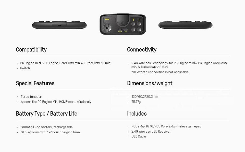 我们为3款TurboGrafx-16迷你游戏机都做了无线控制器。即插即用无线,无延迟--2.4G。它甚至具有涡轮增压功能和即时主菜单访问。
