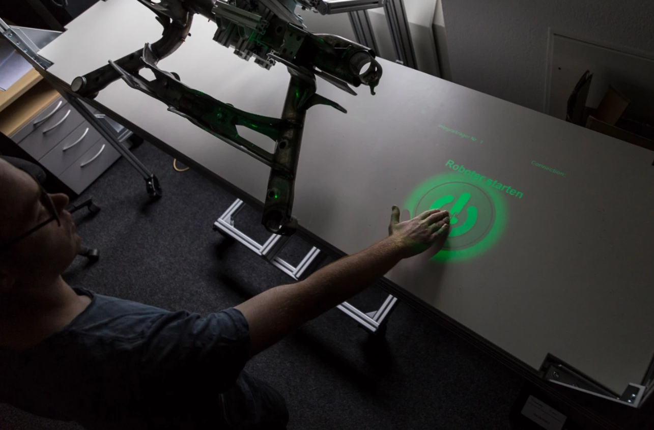 利用语音命令,加上手势识别界面,投影到工作台和零件本身,机械臂将指示将零件放在正确的位置,以便检查其焊缝。如果焊缝有任何问题,同样可以通过手势或语音记录,并利用手指追踪系统记录其位置。