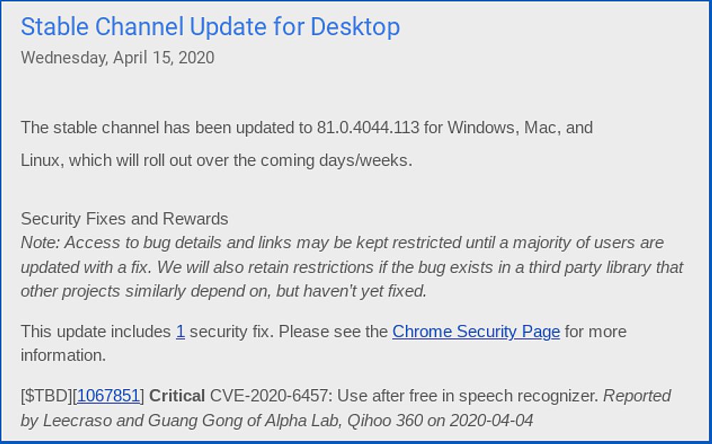 谷歌已经为Chrome浏览器发布了一个紧急修复补丁,并敦促用户尽快安装。谷歌并没有透露有关于CVE-2020-6457漏洞的更多信息,只是确认为“use after free”类型漏洞。
