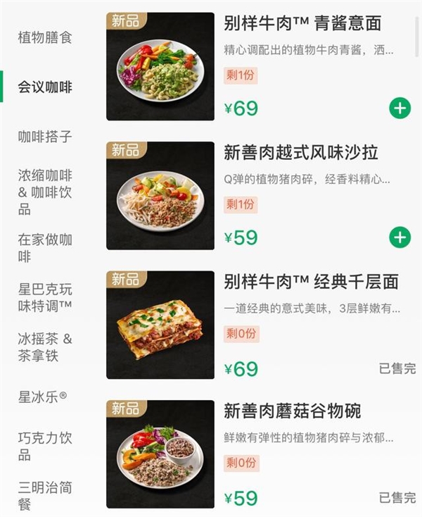 星巴克外送平台“专星送”提供的菜单显示,“人造肉”系列餐食包括:别样牛肉青酱意面、新善肉越式风味沙拉、别样牛肉经典千层面、新善肉蘑菇谷物碗等,价格在59-69元不等。