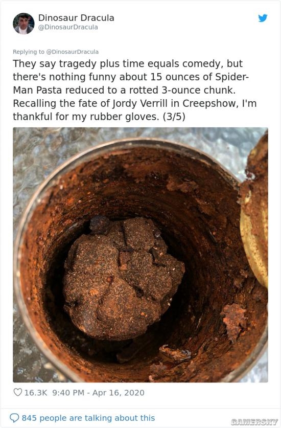 最近,马特,推特账号@ Dinosaur Dracula (一个专职80年代玩具、90年代糖果、假期、恐怖电影和奇怪食谱的账号)发了个25年前的蜘蛛侠意大利面罐头的照片,发文说: “如果这条被转发1995次,我就给你看里面有什么。”