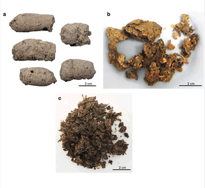下图是用于研究的千年古粪样品。AI认为A是狗粪A、B不确定、C是人粪。你同意它的判断吗?