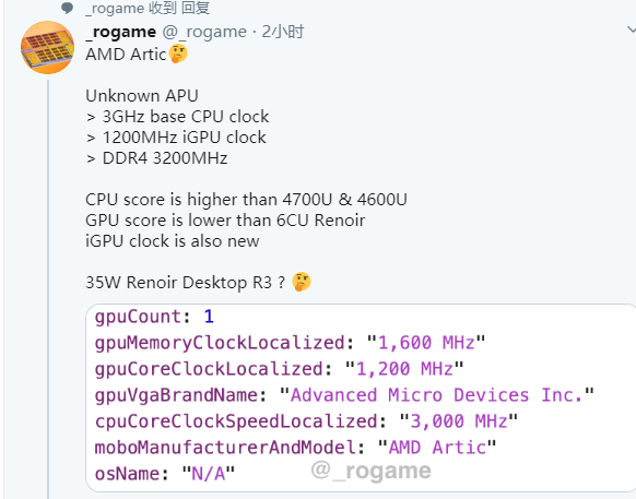 随着锐龙4000系列笔记本处理器的上市,AMD现在的CPU产品线中还少最后一环——7nm Zen2的锐龙APU桌面版,取代目前的锐龙3000G系列。好消息是,现在有点眉头了。经常爆料AMD最新消息的网友rogame今晚曝光了一款未知的AMD APU处理器,其中CPU基础频率大于3GHz,iGPU核显频率大于1200MHz,支持DDR4-3200内存,没说核心数,看爆料猜测是6核12线程版的。