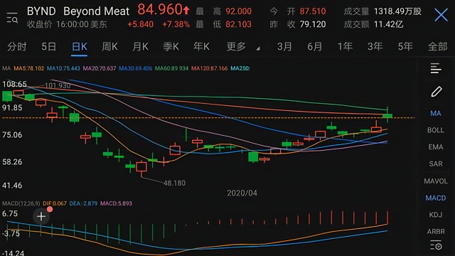 而作为星巴克的植物牛肉的供应商,植物膳食品牌别样肉客 (Beyond Meat)也在近期呈现出上涨的态势,从3月18日到4月21日收盘,其股价从54.02美元涨至84.96美元,上涨57%。