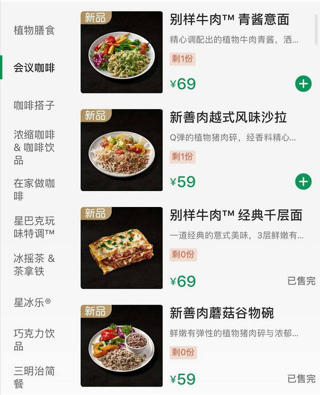 相对于星巴克出售的真肉产品——普通牛肉卷价格为39元,而对应的植物牛肉卷的定价为59元,后者价格高出51%。