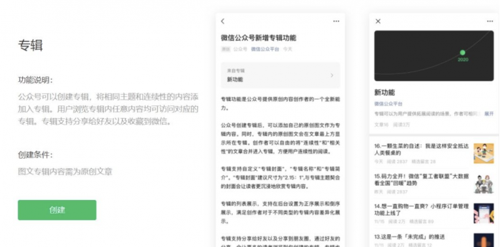 专辑功能的灰度上线,正是微信在这一方向上的尝试。目前,这个功能仅对开通了原创声明的公众号开放申请。公号主可以添加原创内容形成合集,方便用户进行连续性阅读。专辑支持分享、收藏功能。