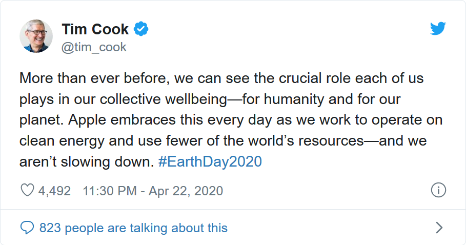 不同以往的是,由于今年全球发生了新冠病毒大流行,苹果的庆祝活动变得低调许多,随着零售店的关闭,这家公司没有机会在店内庆祝。相反,苹果正在其应用商店推广跟地球日相关的应用,另外还分享了一个地球日主题的Apple TV+短片。