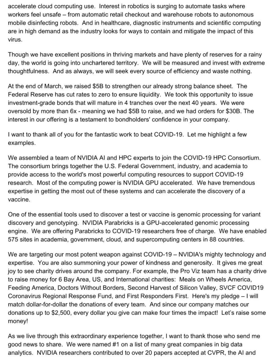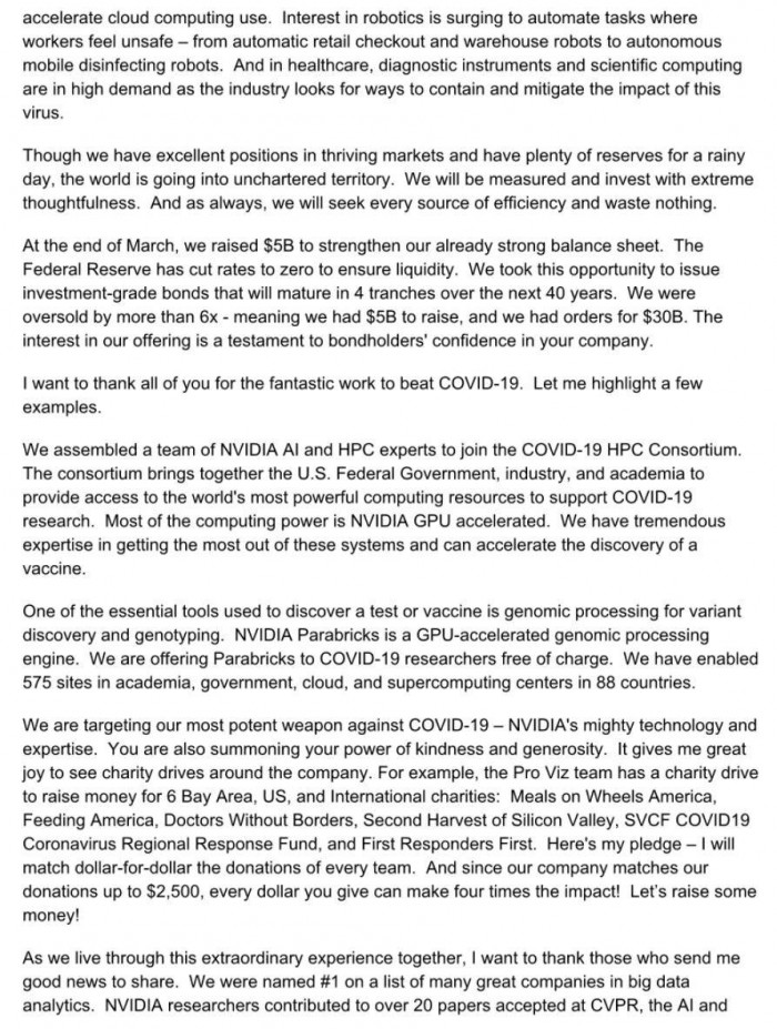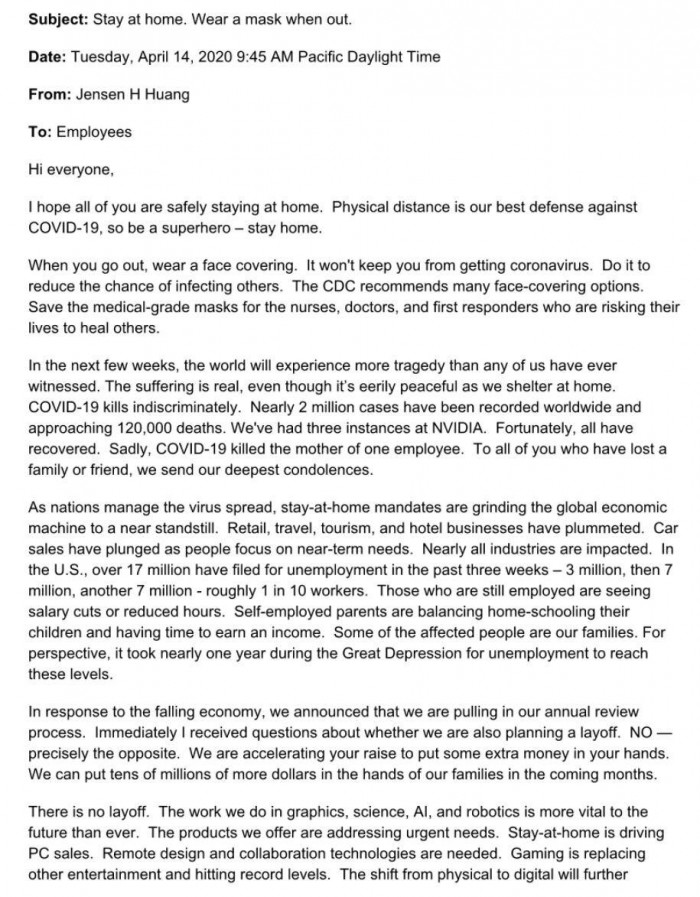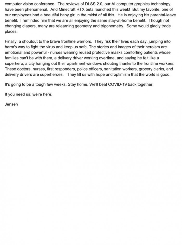 疫情期间每个人都过得不容易,不仅面临新冠病毒的死亡威胁,而且还需要经历减薪、裁员等坏消息,甚至还有黑客利用疫情传播恶意程序和勒索诈骗。不过NVIDIA首席执行官黄仁勋发布的公开信给公司员工带来曙光,不仅不会裁员,而且还会加薪。