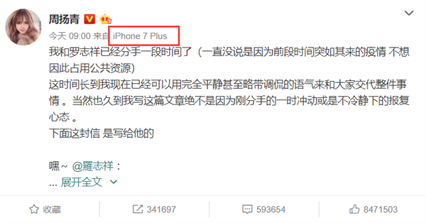 值得一提的是,有网友发现,罗志祥微博常用的手机是一部iPhone 7 Plus,周扬青日常用的也是iPhone 7 Plus。