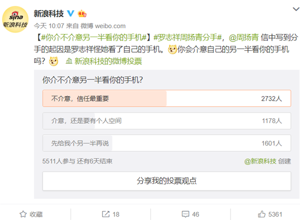 消息曝光后,#你介不介意另一半看你的手机#在微博上引发热议。从新浪科技发起的“你介不介意另一半看你的手机?”投票来看,选择“不介意,信任最重要”的网友最多,达到2732人;其次是“先给我个另一半再说”,有1601人;选择“介意,还是要有个人空间”的最少,为1178人。