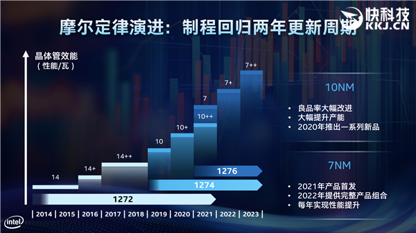 那Intel 7nm及以下工艺的水平如何呢?现在还没公布官方细节,不过Intel从22nm工艺到14nm是2.4x缩放,14nm到10nm是2.7x缩放,都超过了摩尔定律的2x工艺缩放水平。