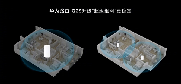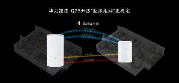 华为路由Q2S支持电力线(PLC Turbo)、网线、Wi-Fi 2.4GHz、Wi-Fi 5GHz(双频优选)四链路同时混合组网,在任何有插座、有网线的地方都可以设置子路由,真正做到哪里信号不好插哪里。