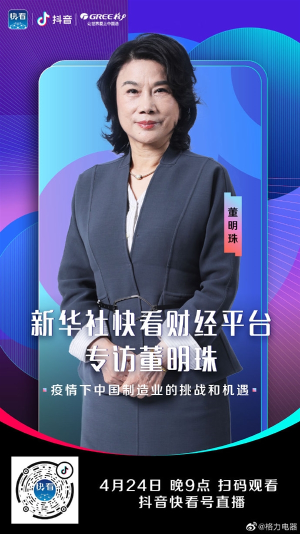 直播之后,晚上9点董明珠将接受新华社旗下的快看财经平台的专访,探讨疫情下的的中国制造业的挑战和机遇。