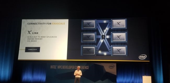 Ponte Vecchio是Intel的第一个百亿亿次级GPU,首发采用7nm工艺制造(还不确定是Intel自己的抑或台积电的),利用Foveros 3D封装技术、CXL高速互连标准,每一颗GPU内部都会集成多达八个小芯片(据说最多1000个EU单元),然后六颗GPU搭配两颗Intel Sapphire Rapids至强处理器,组成一个计算节点。
