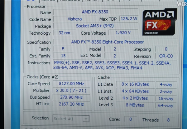 它还是32nm工艺,8核心8线程(某种程度上也可以说4核心8线程),基准频率4.0GHz,最高加速4.2GHz,二级缓存8MB,三级缓存8MB,热设计功耗125W。