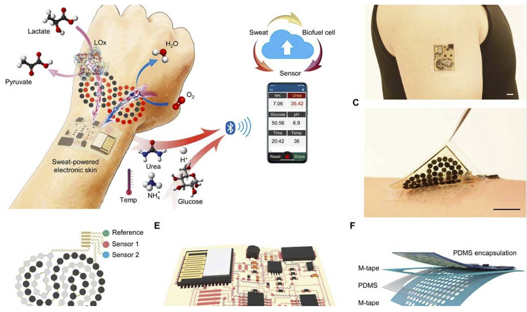 而内置在电子皮肤当中的燃料电池可以吸收乳酸盐,并与大气中的氧气结合,生成水和丙酮酸,这是新陈代谢的另一个副产品。生物燃料电池可以产生足够的电力来为传感器和类似于连接手机和汽车音响的蓝牙设备供电。