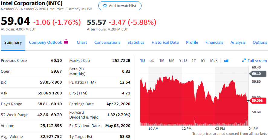 彭博社星期四刊文称,苹果计划从2021年开始销售搭载自主处理器的计算机。据悉,苹果有意明年发布至少一款搭载自主处理器的Mac计算机,但在开发3款处理器,表明苹果“将使更多Mac产品弃用英特尔处理器”。报告还指出,台积电将利用5纳米工艺为苹果生产处理器。苹果、英特尔和台积电没有就此消息发表评论。受此消息影响,常规交易中,英特尔股价下跌1.06美元,跌幅为1.76%,报收于59.04美元。股市收盘后英特尔发布了第一季度财报,虽然1.45美元的调整后每股收益,以及198亿美元的营收双双超过分析师预期。英特尔对第二季度每股收益预期低于分析师,但对营收预期高于分析师。受疫情影响,更多上班族居家办公,对笔记本和云服务的需求出现增长,拉升了对英特尔PC和服务器芯片的需求,但分析师认为这种拉升作用是短期的。盘后交易中,英特尔股价一度下跌3.47美元,跌幅达到5.88%。