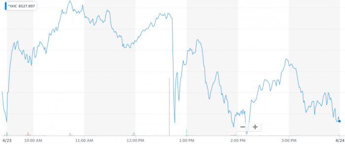 凤凰网科技讯 北京时间4月24日消息,星期四美股涨跌不一,纳指尾盘下跌,微跌0.63点。截至收盘,道指涨39.44点,涨幅为0.17%,报收23515.26点;标普500指数跌1.51点,跌幅为0.05%,报收2797.80点;纳指跌0.63点,跌幅为0.01%,报收8494.75点。