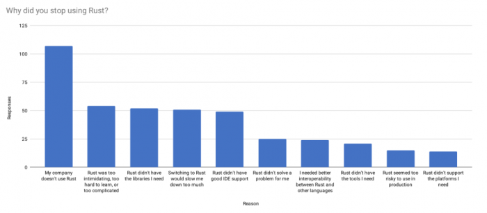 上文提到,有 7.1% 的受访者使用过 Rust 后又停用了。对于这部分用户,停止使用 Rust 的最大原因是所在的公司不再采用 Rust。学习曲线、缺少所需的库、缺乏 IDE 支持等也是常见的阻碍因素。