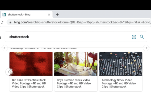 当在必应上搜索 Shutterstock 时,首页上显示的“趋势结果”,似乎都指向了色情类视频的链接。