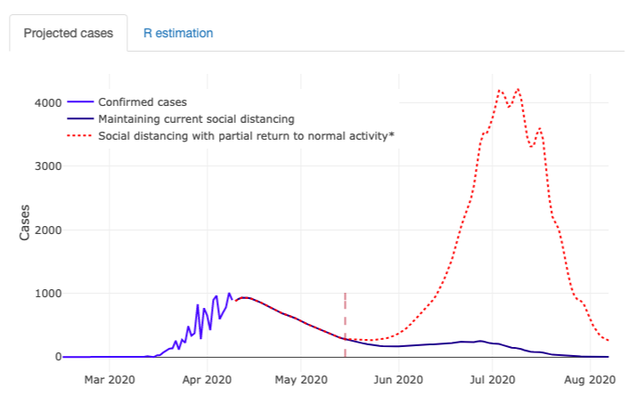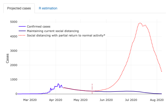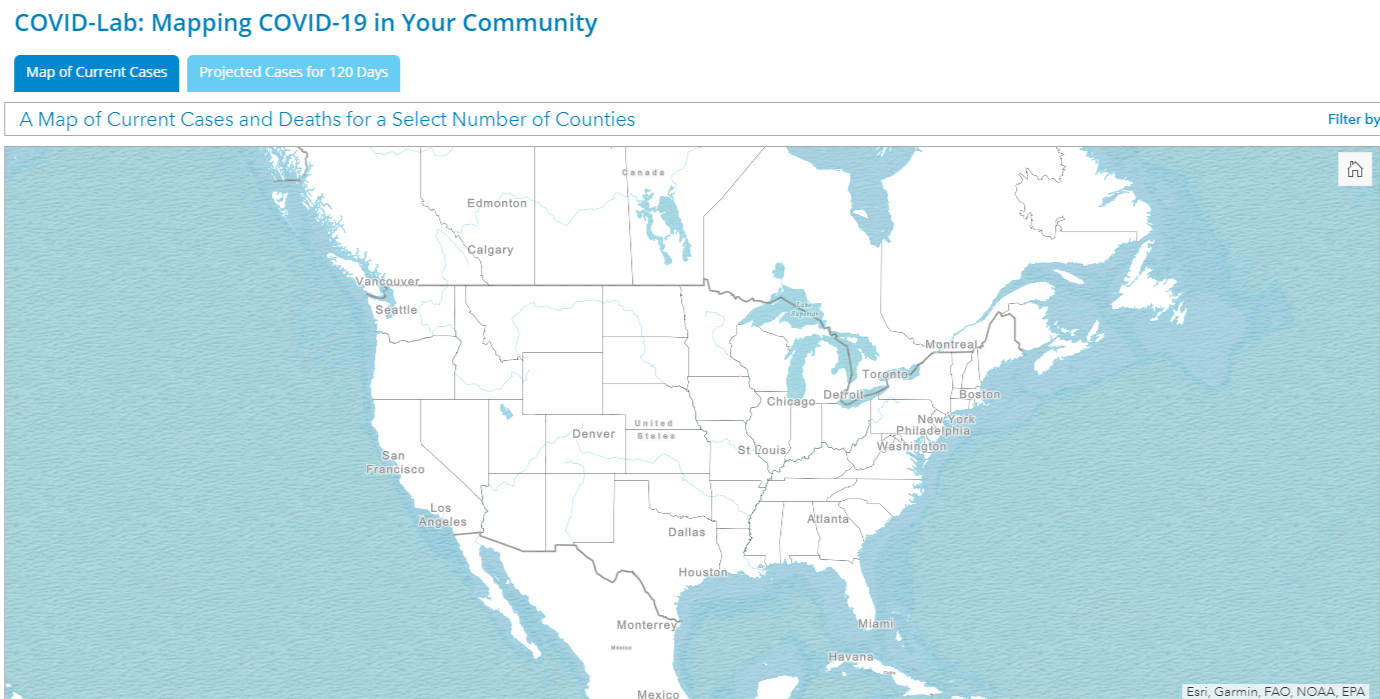 这个工具被称为"COVID-Lab: Mapping COVID-19 in Your Community"。 用户首先会看到一张美国地图,然后可以按州选择,再选择县级地区。构建这个工具的研究人员在建模时使用的是一个任意的日期,即5月15日,作为开始放松隔离措施的起点。在这一天--同样是为了建模的目的--他们想象着如果允许该地区的活动恢复到正常的50%,可能会发生什么。"瞬时传染数(R)是使用每天新病例的发生率来估计的,同时包括社会疏远,人口密度,以及之前14天的综合温度和湿度滞后的影响,"是该网站如何解释其方法。"每个县的影响都是按人口人口统计学标准化的。"