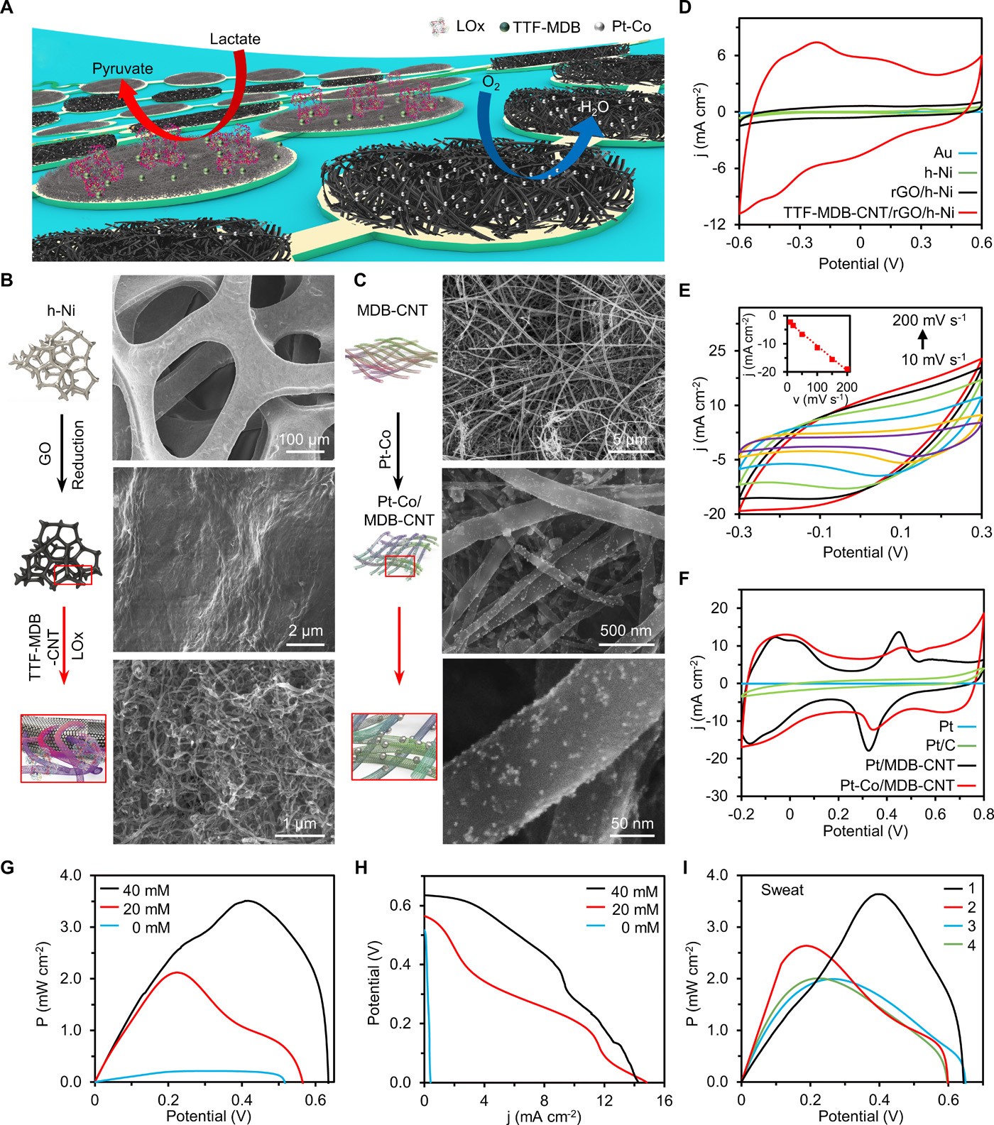 我们的汗液中含有浓缩的乳酸。这种正常新陈代谢过程中的副产品会被电子皮肤的燃料电池吸收--这些燃料电池由碳纳米管制成,里面有铂/钴催化剂和一种酶,这些酶可以分解乳酸盐,并被复合网状物所容纳。在这里,人体的排出物与周围空气中的氧气混合,生成水和丙酮酸。