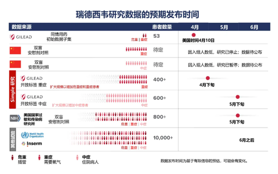 这项在中国进行的试验的结果,以及4月10日发表的对危重患者的同情用药队列研究的结果,为瑞德西韦提供了越来越多但仍非结论性的数据。瑞德西韦是一种未经批准的在研药物,其治疗新型冠状病毒肺炎的安全性和有效性尚不明确。多个正在进行中的三期研究将提供额外的数据,以确定瑞德西韦作为新型冠状病毒肺炎治疗药物的潜力。这些研究将有助于明确使用瑞德西韦的治疗对象、治疗的启动时间以及持续时间。这些研究有的已经完成初级分析所需的全部入组,有的按照计划即将完成入组。
