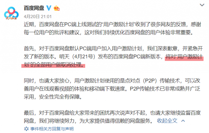前几天百度网盘用户激励计划的事,各位差友应该都知道了。简而言之,就是百度网盘趁大家没留意偷了大家流量。这事爆出来后,网上群情激奋,百度官方反应也很快,表示会对全部用户做取消处理。