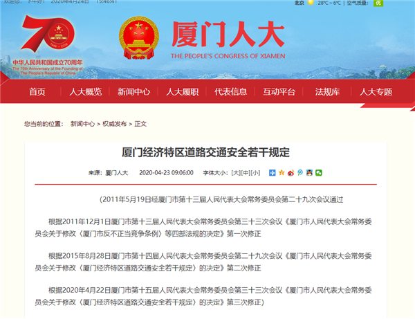 据了解,《厦门经济特区道路交通安全若干规定》是厦门市道路交通安全管理的重要法规,自2012年起施行,此前经过两次修正。