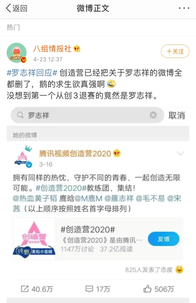 起码,前不久才官宣罗志祥为导师的鹅厂自制综艺节目《创造营2020》,在风波曝出之后,就第一时间删除了所有与罗志祥有关的微博动态。虽然还没有官宣,但是删除微博的深意已经很明显了。