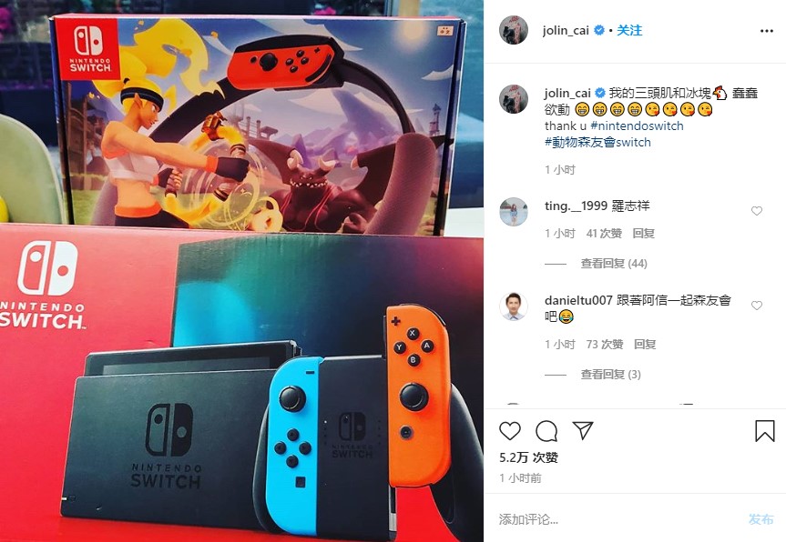 今天(4月24日)台湾著名女歌星 Jolin 蔡依林,在自己的 insgram 账号上晒出了刚购入的 Switch 主机以及大热的健身游戏《健身环大冒险》。蔡依林也附文说道,她的“三头肌和冰块肌已经蠢蠢欲动了”。