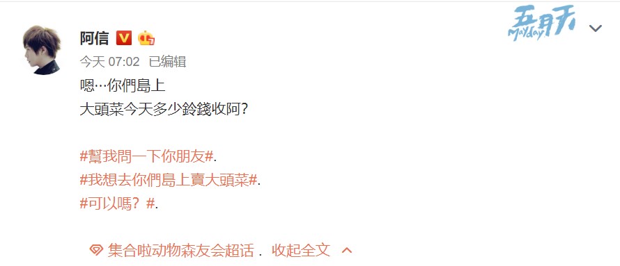 但是不清楚的是蔡依林本次是否只买了《健身环大冒险》一款游戏,有网友也在评论区向 Jolin 建议:“跟着阿信一起森友会吧。”4月20日,五月天主唱陈信宏突然在其微博上向粉丝询问本日《集合啦!动物森友会》的大头菜价如何,看来阿信最近也正沉迷动森无法自拔,不知道他能否也将蔡依林拉入坑呢?
