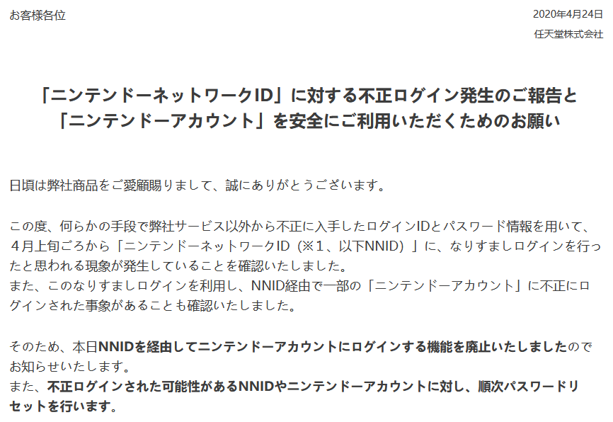 任天堂正在禁用通过任天堂网络ID(NNID)登录Nintendo Accounts的方式,这是因为此前已有16万个账户受到黑客攻击企图的影响。任天堂表示,自4月初以来,“通过我们的服务以外的其他一些手段非法获得的登录ID和密码已经被用于访问这些账户。”