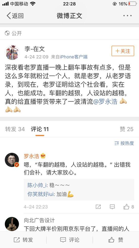 对于罗永浩的行为,网友表示,“车翻的越稳恨,人设站的越稳。”对此老罗回复,“出错我们会补,请大家放心。”