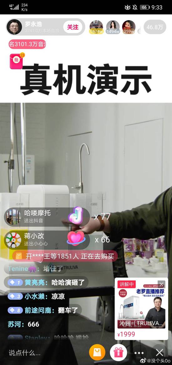 此外,在展示立白环节,PPT上价格标注错误为9.9元,而用户付款时却变成了23.9,对于团队接二连三的事故,罗永浩看起来有些崩溃,他非常严肃的表示,将会责令团队,连夜开会,进行补救,并再三向直播间的网友承诺,“有龙哥在,别怕,请大家放心买。”