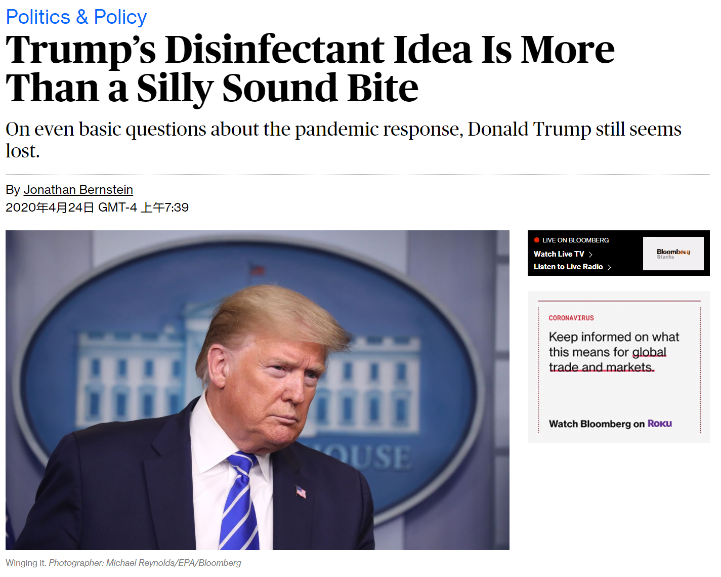 彭博社专栏作家约翰森·伯恩斯坦在专栏中说:“特朗普又一次超越了自己”。伯恩斯坦称特朗普关于消毒剂的想法,不仅仅是个愚蠢的声明。这体现出就算在最基本的疫情响应问题上,“特朗普看起来依然是迷失的”。