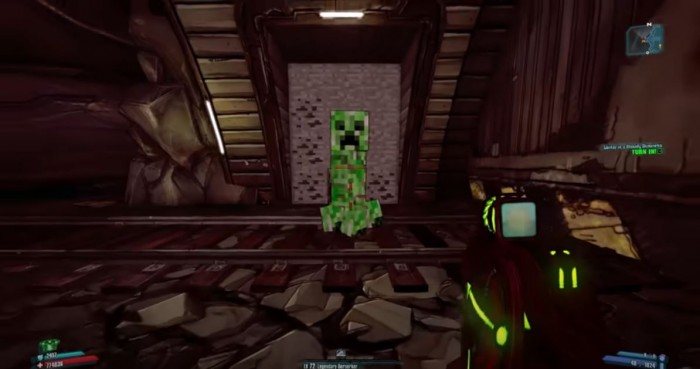 《无主之地2》想必大家都不陌生,但是这款作品中有一个《我的世界》关卡你知道吗?在 Caustic Caverns(腐蚀洞穴)地图西北部有一条很明显的铁轨,铁轨尽头通往一扇大门,彩蛋就在那扇门后。在这个地图中,除了熟悉的方块之外还有着苦力怕,完成任务的奖励套装也非常有意思。