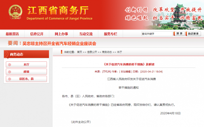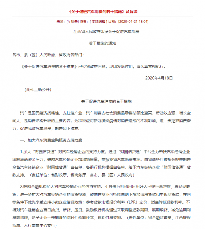 当下,全国各地都出台不少了政策,以鼓励汽车消费。日前,我们从江西省商务厅获悉,4月21日,江西省人民政府印发《关于促进汽车消费若干措施》的通知,从加大汽车消费金融服务支持力度、减免车辆相关税收、组织开展汽车促消费活动等方面提出了十条促消费举措。