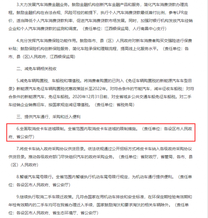 其中,在第三条“提供汽车通行、采购和迁入便利”中提出,全面取消皮卡车进城限制,全省范围内取消皮卡车进城的限制措施,并将皮卡车纳入政府采购协议供货目录。