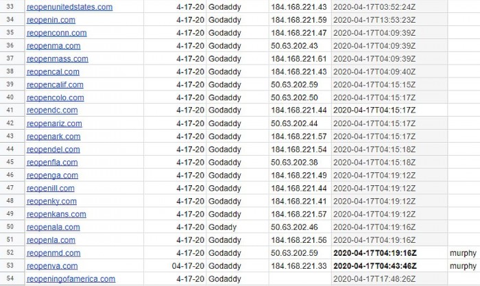 在Reddit社区上,讨论集中在少数几个新域名上,包括reopenmn.com,reopenpa.com和reopenva.com,这些域名似乎与这些州的各个枪支权利组织有关。他们的注册与明尼苏达州,加利福尼亚州和田纳西州的同时示威活动大致吻合,在过去几天中,人们出现在抗议隔离措施的抗议活动中。