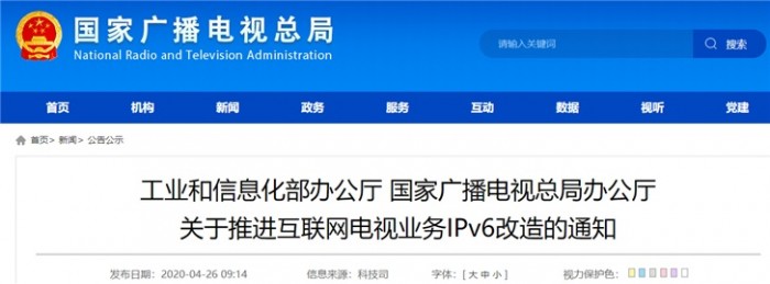 4月26日,工信部、国家广播电视总局发布关于推进互联网电视业务IPv6改造的通知。通知要求,中国电信、中国移动、中国联通要对互联网电视业务经过的骨干网、城域网、接入网以及互联网骨干直联点相关设备进行IPv6改造。