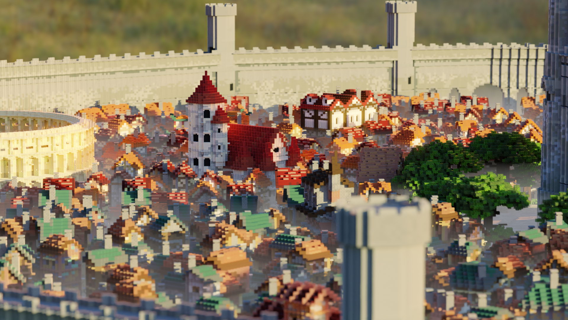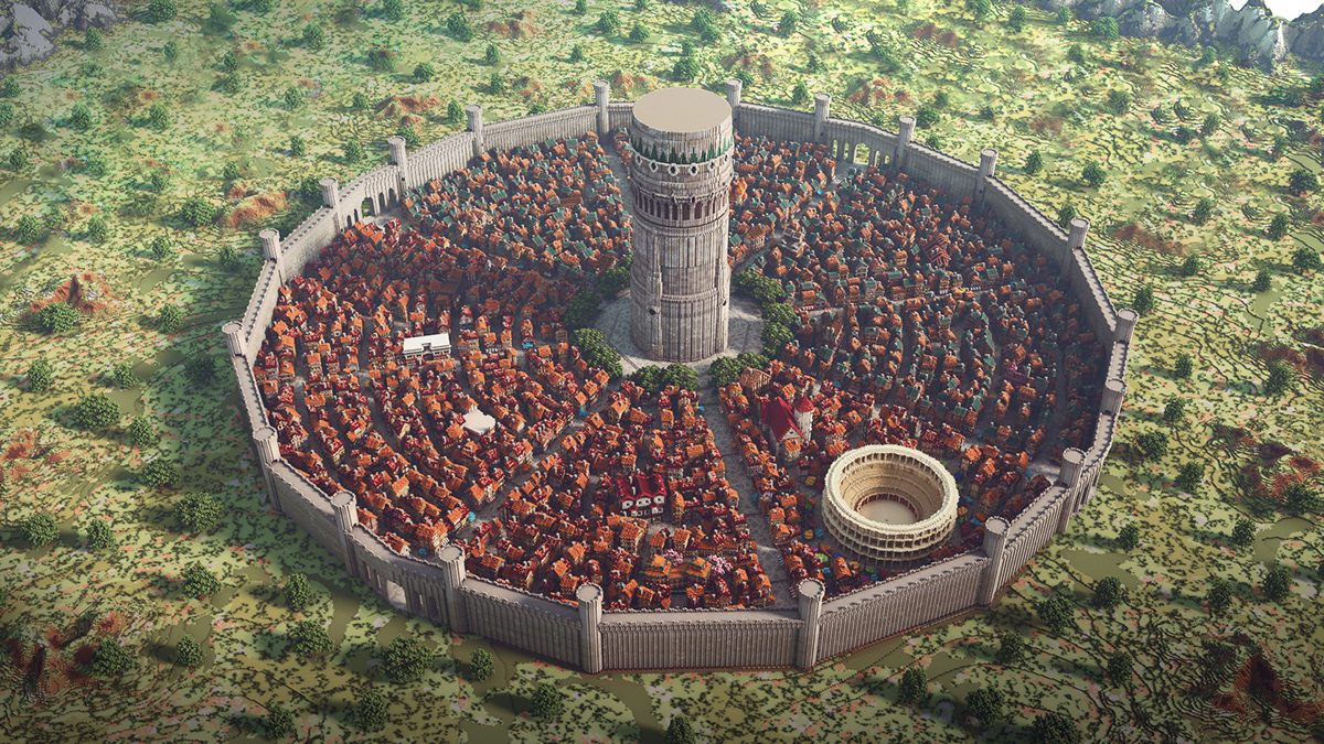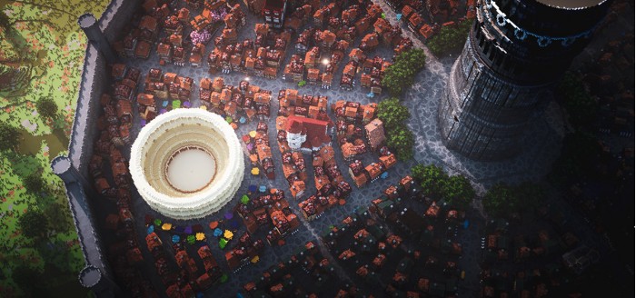 Varuna团队为打造欧拉丽耗费了2个月时间。从图中可以看到,该都市由大量房屋环绕中心的巨塔而建造,还原度高细节到位。遗憾的是欧拉丽不能下载游览,因为这是Varuna为《我的世界》私服有偿打造的,我们只能看图解馋了。