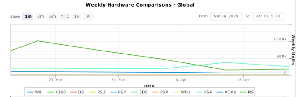 而根据上方一个月区间的全球硬件销量统计折线图我们也能够发现,《最终幻想7重制版》的发售导致PS4的主机销量在上上周迎来了上扬,上周销量也依旧比较坚挺,而任天堂Switch则面临了严重的缺货问题,导致不论是日本本土还是海外市场都没法保持三月份的热销势头。