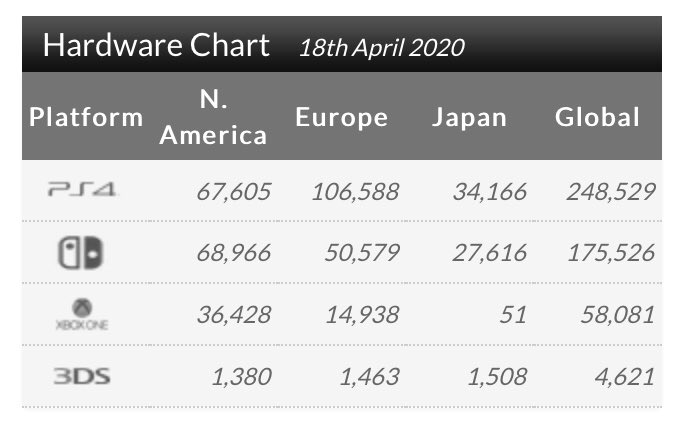 根据老牌市场统计机构VGChartz公布的统计数据,截至4月18日的上周全球硬件销量数据榜单已经出炉,PS4全球销量近25万台,超越了NS的18万。总的来说PS4占据了上周51.5%的市场份额,而NS和Xbox One分别占了36.4%和12.1%