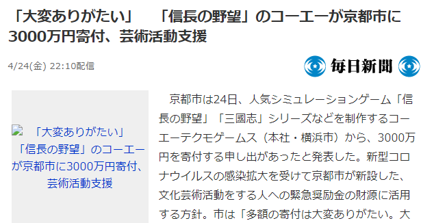 ·光荣特库摩的发家地虽然不在京都,不过由于2008年在京都设立了品质管理部分社,对京都或许还是有感情的,而京都市政府表示该笔捐款将集中用于支援因疫情扩大受到影响的文化艺术活动。
