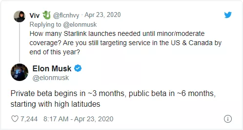 4 月 23 日,马斯克在推特上公布了这一项“伟大”的计划的最新目标:“星链内测差不多三个月后开始,公测六个月以后。”
