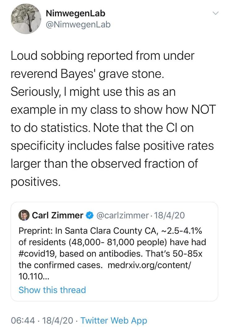 根据其对特异性的估计,只有 0.5% 的检测为假阳性,但实际上该产品仍存在高达 1.7% 假阳性的可能性。如此说来,上述圣克拉拉研究得到的 1.5% 阳性率(3330 份样本中发现 50 例阳性)意味着他们测出的阳性结果有可能全部都是假阳性,就算不是全部,其参考价值也可以说非常差。